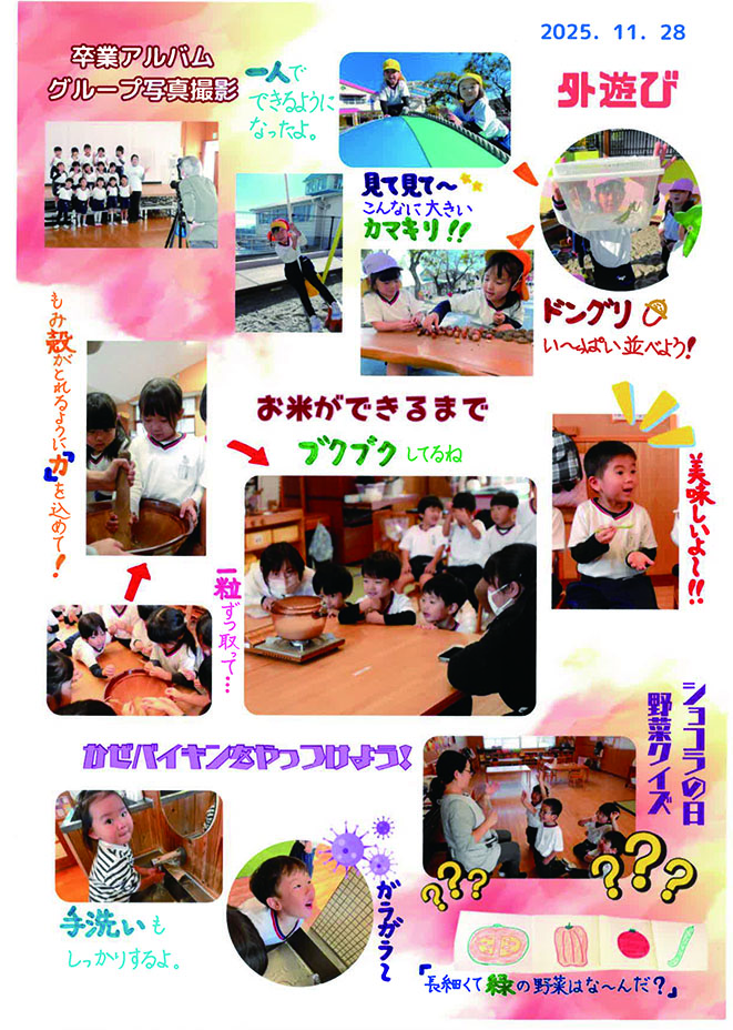 ●運動会では準備から当日までおつかれさまでした。当日まで本番が出れるか不安でしたが、無事に参加することができました。リレーは勝ちたくて一生懸命走ってましたが負けてまいました。悔しそうでした。それもまたいい経験になったのかなと思います。鼓隊も組体操も真剣な顔で幼稚園最後の競技かと思うと感動でした。子どもの姿に花丸です!!